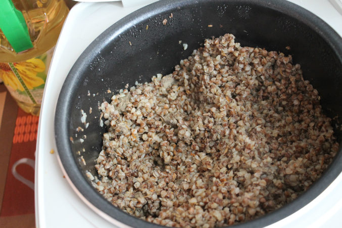 лук режем,морковку трем на терке,включаем режим "жарка" все это обжариваем,печень моем режем не большими кусочками выкладываем в мультиварка и включаем режим "тушение" на 10-15 минут,далее добавляем гречку (я всегда промываю),воду,сливки,специи,перемешиваем,закрываем крышку и включаем режим "рис".