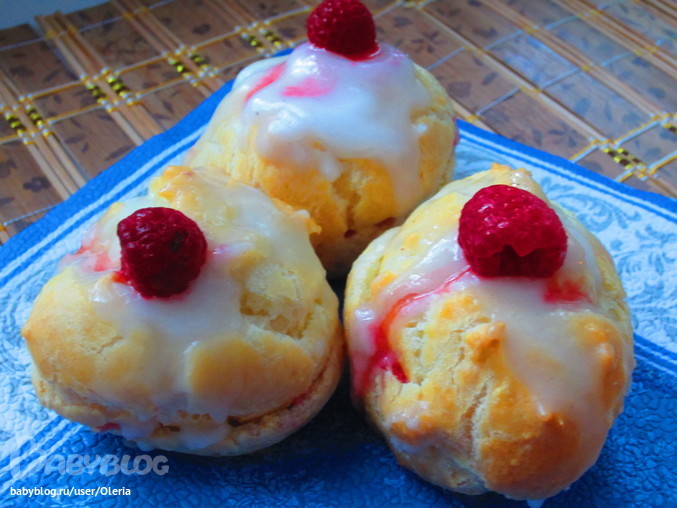 Пироженки хорошо поднимаются и не осядают! Достать их из духовки и остышие разрезать пополам( как эклеры) и заполнить начинкой. Полить глазурью и украсить малинкой)