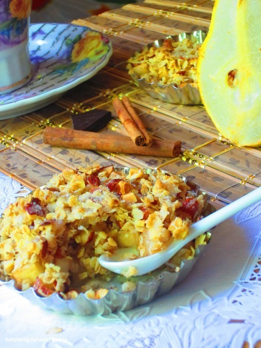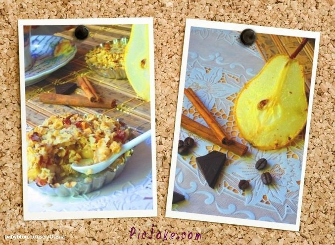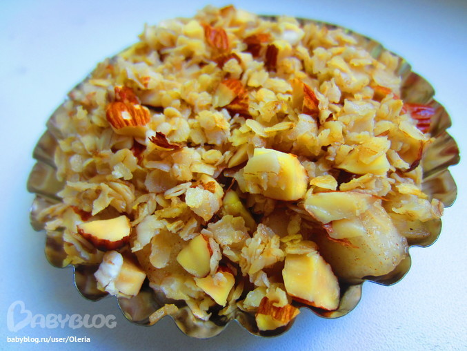 У меня грушевый крамбл из овсяных хлопьев с миндалем и кокосом.
