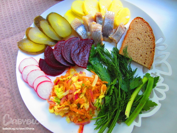 Капусточка маринованная с морковкой, лучком красным и чесноком, селедочка малосольная, зелень, огурчик малосольный, свекла маринованная, да картошечка молодая с маслицем)))и редисочка и горбушка черного!!! Сварганила, да чуть с ума не сошла от удовольствия)))