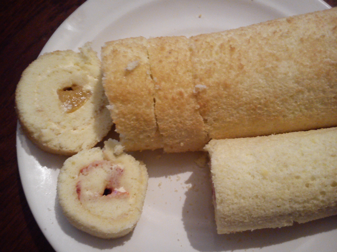 Обычный бисквит.Делала по этому рецепту на 6 яиц. Выпекала на перг.бумаге минут 15 на маленьком огне.Вытащила,скрутила.Чучутьполежал.Развернула и убрала бумагу. Промазала кремом:сгущёнка+сл.масло.