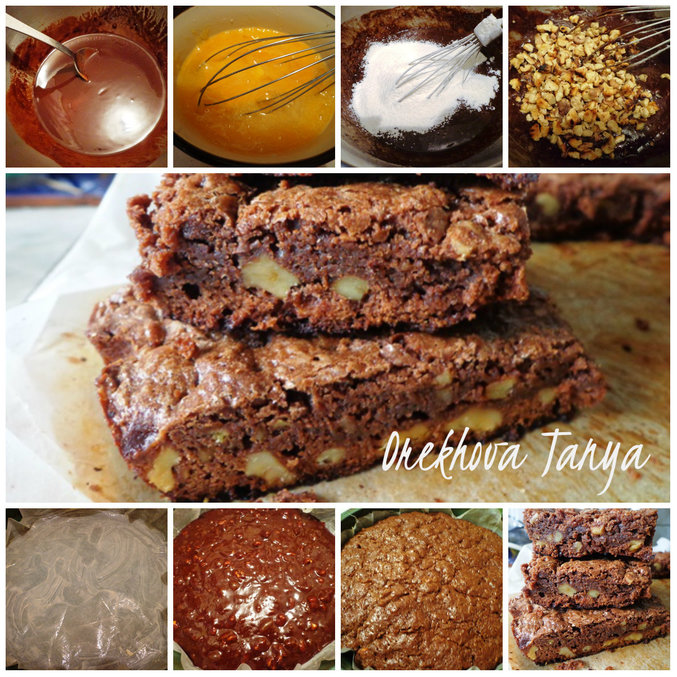 Приготовление: растопить масло и шоколад, добавить все остальное, выпекать 40-50 минут.