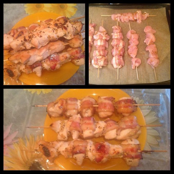Куриное филе нарезать кубиками или небольшими полосочками, слегка посолить. Затем обернуть полоской бекона каждый кусочек филе, нанизать на деревянные шпажки и выложить на противень застеленный пергаментной бумагой.