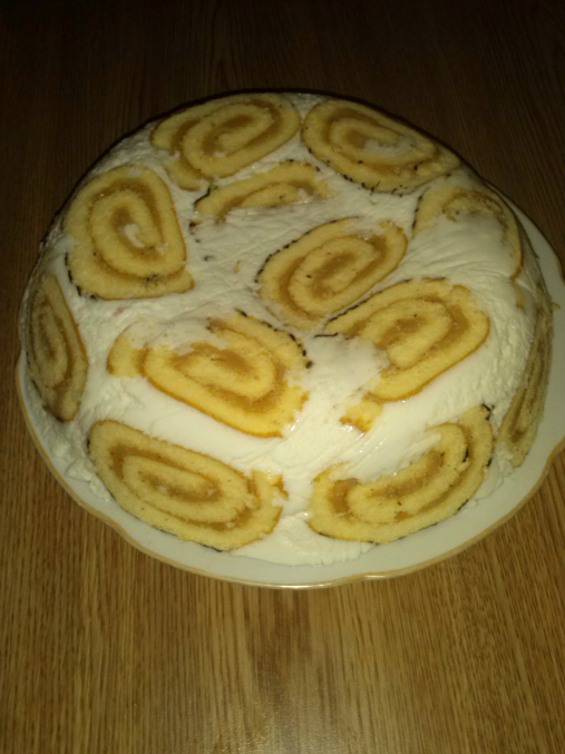 Дно формы застелить пленкой, бортики и дно выложить кружочками рулета.