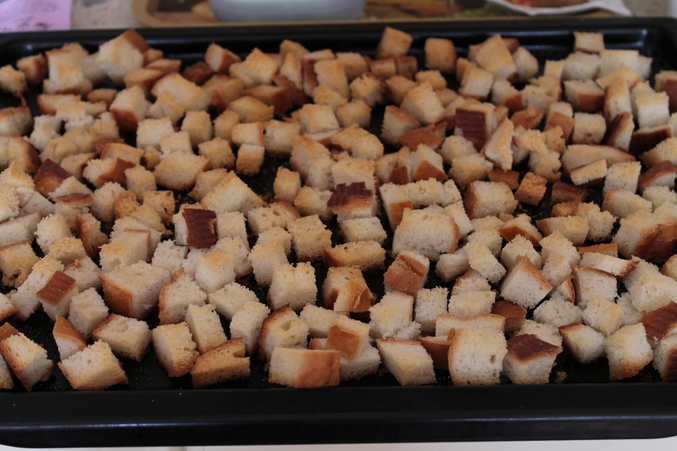 Ставите весь это хлеб в духовку на 10 минут при 180 градусах и в результате получаете вкуснейшие сухарики!