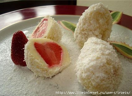 Примечание: можно использовать вместо клубники вишню, сливы, абрикосы и так далее…. А можно сделать просто сладкую творожную массу, добавить вместо сахара топлёный белый шоколад, немного меньше масла, накатать снежки и обвалять в орехах или кокосе.