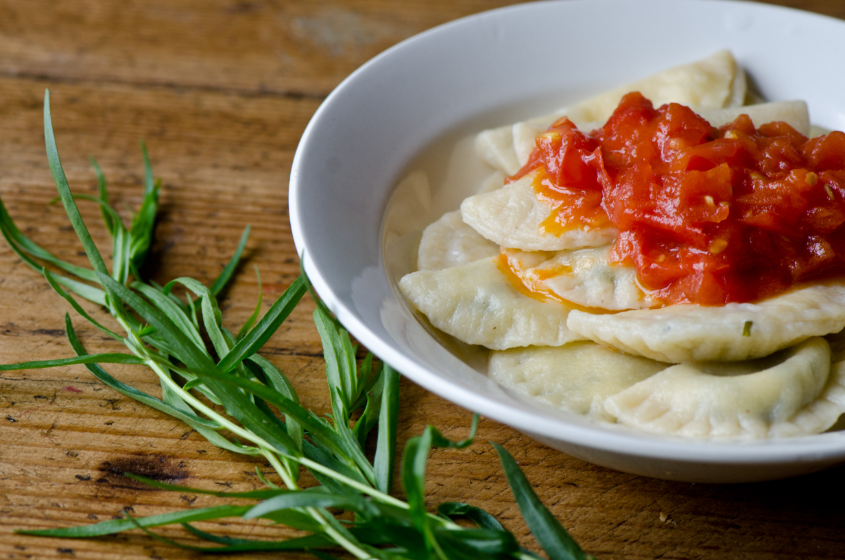 4. Эстрагон мелко порезать и смешать с плавленным сыром. Поперчить. Помидоры ошпарить, снять кожицу, крупно порезать. Тесто очень тонко раскатать, вырезать из него стаканом кружочки. Плавленный сыр разложить кружочки. Края квадратиков увлажнить, и защипнуть. Равиоли варить как пельмени 7 минут. Кусочки помидоров потушить в сливочном масле, посолить. Разложить на тарелки вместе с равиоли.