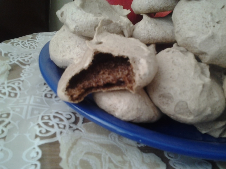 - Белки взбить до устойчивых пиков, постепенно добавляя сахар, просеянное какао. Тертый шоколад вмешать ложкой.