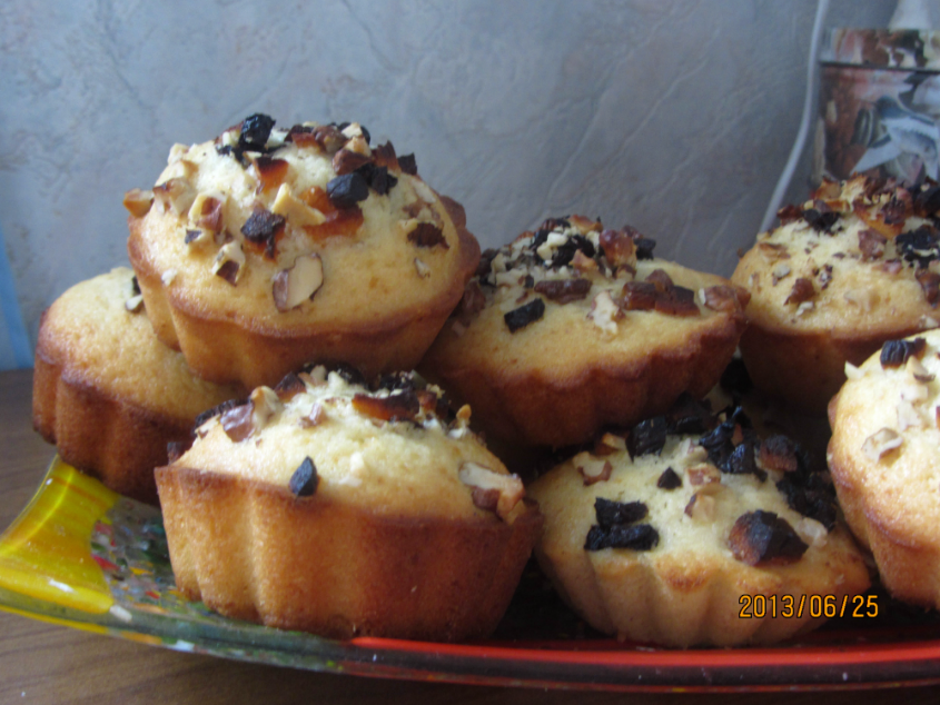 Сегодня я приготовленную массу разложила по формочкам для кексов, посыпала нарезанным черносливом и грецким орехом. Из указанных ингредиентов у меня получилось 12 мини-кексов.