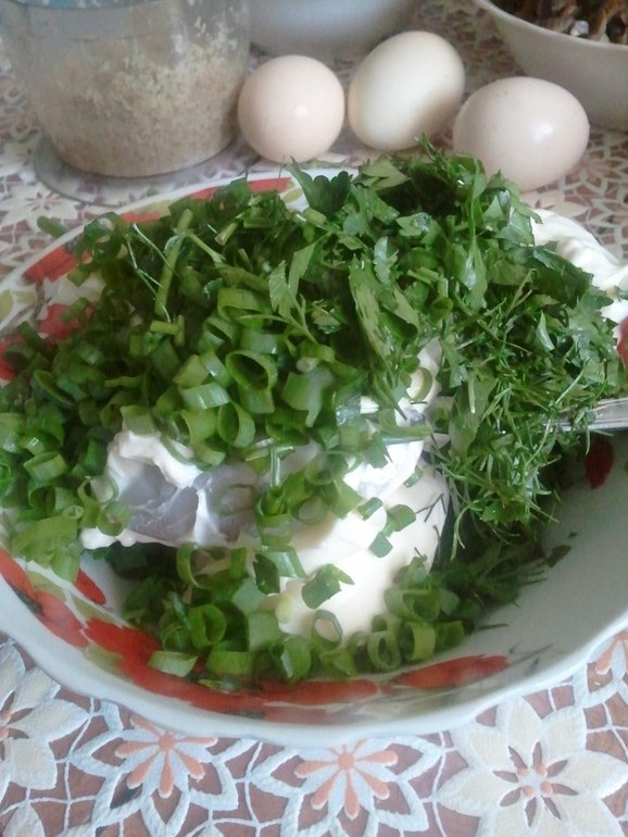 Основа: сыр (хохланд, альметте и т.п.), зелень, перец молотый, майонез можно добавить сразу в основу или отдельно в каждый слой.
