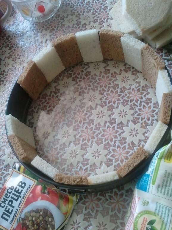 Нарезаем хлеб прямоугольниками по высоте формы. Чередуя черный и белый хлеб выкладываем по бокам формы.
