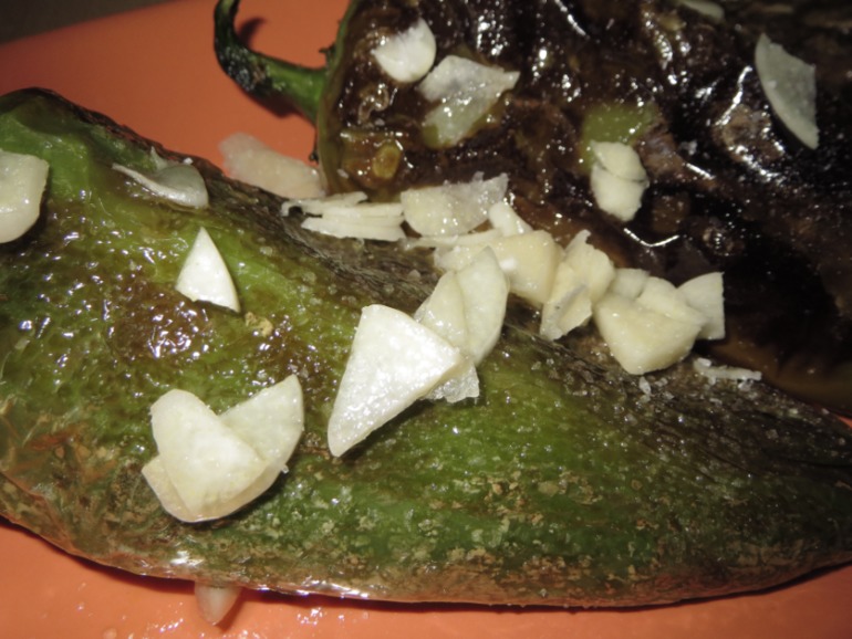 Чистый перец с плодоножкой обжариваем со всех сторон, посыпаем солью и рубленым чесноком.
