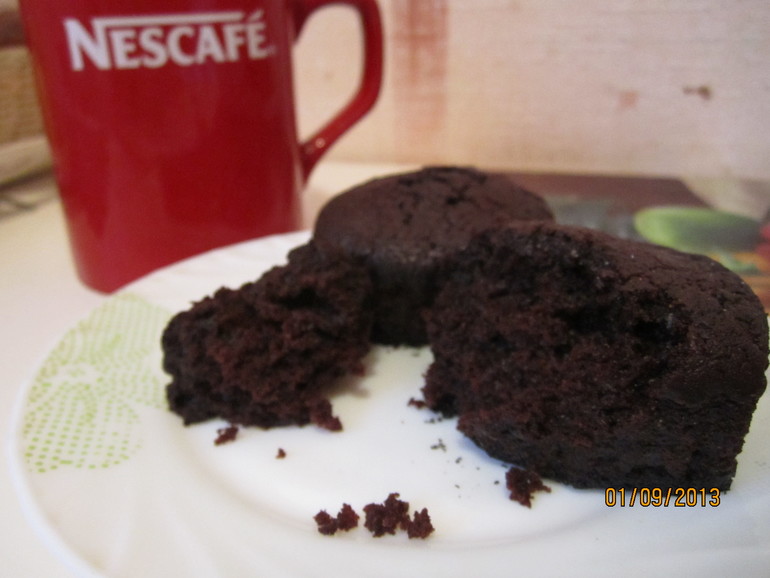 Снять кастрюлю с огня, добавить к массе шоколад, поломанный на кусочки и кусочками же нарезанное сливочное масло. Перемешать.Добавить одно яйцо и растительное масло, размешать.Добавить оставшийся сахар, второе яйцо и ванилин на кончике ножа. Снова перемешать.Высыпать в шоколадную смесь муку, смешанную с разрыхлитем и перемешать. Смазать формочки и в духовку на 20 минут при 180)