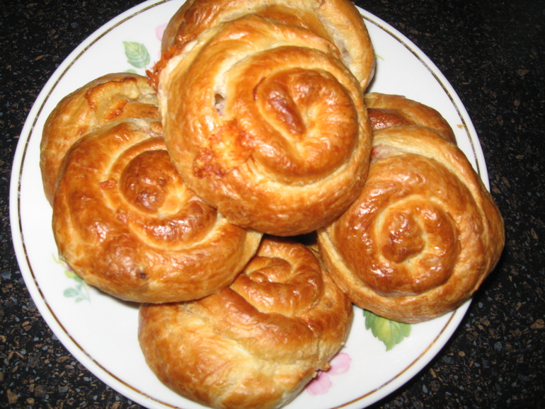 Слоеное тесто раскатывается в прямоугольник, нарезается вдоль на полоски примерно 4 см, в серединку полосочки выкладывается начинка по всей длине, защипывается, чтобы получилась колбаска. Дальше эта колбаска сворачивается улиткой швом вовнутрь. Выкладывается на противень, смазывается желтком и выпекается до готовности.