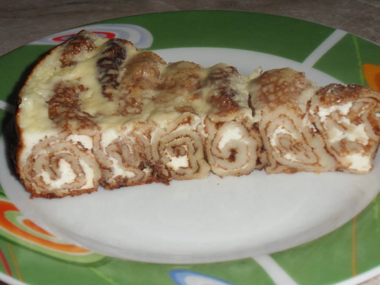 Напекла тоненьких блинчиков. Намешала творог с курагой, черносливом и изюмом. Туда песочка , яичко и ванильки. Сложили всё на сковороду спиралькой и залила заливкой. (3 ст ложки сметаны, песок и 2 яйца. )