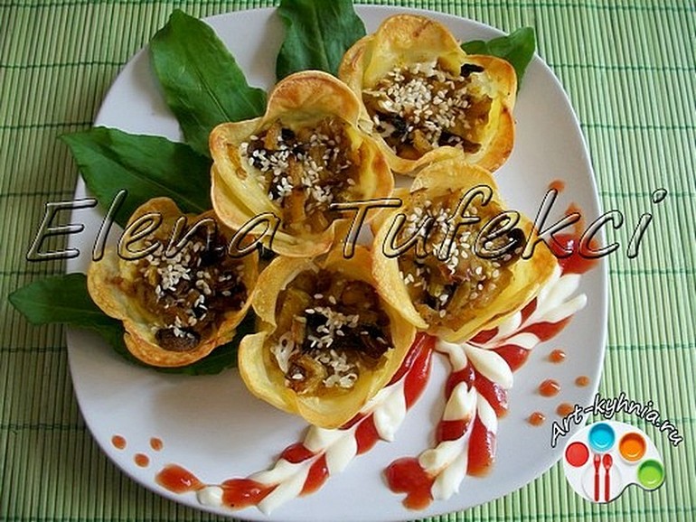 Картофель очистить и нарезать тонкими пластинами. Взять формы под кексы и выложить в них картофельные пластины в виде цветка . Потереть сыр на терке, добавить желтки, посолить и взбить в однородную массу. Влить по 1-2 ст. л. в цветки. Нарезать грибы, перец и кабачок. Обжарить на сковороде, посолить, поперчить. Выложить сверху сырной массы начинку. Картофельные лепестки смазать подсолнечным маслом. Поставить картофельные цветы в разогретую до 180 °C духовку и выпекать до золотистой корочки картофеля. За 5-10 минут до готовности цветки внутри посыпать кунжутом. Пошаговые фотографии приготовления можно посмотреть здесь http://art-kyhnia.ru/2bluda/73-cvety-iz-kartofelya-s-nachinkoy-mk-ot-eleny.html