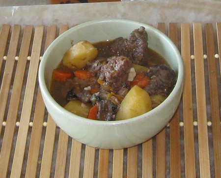 очистить и нарубить лук, обжарить в оливковом масле прямо в котелке, добавить нарубленное мясо, накрыть крышкой - тушить 80 минут, посолить поперчить