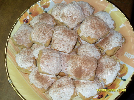 3 яйца взбиваем с 1 ст.сахара,добавляем 200гр маргарина,3-4 ложки стол.сметаны,смешиваем это все с 1ст.кефира в кот.погасили 1ч.л.соды уксусом,ванилин,муки на глаз,чтоб можно было шарики катать руками.В духовку на 1 час при температуре 230 гр.Сверху помадка:1 белок взбитый с 1стаканом сахарной пудры.