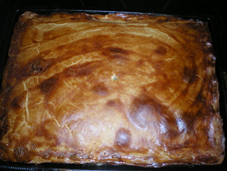 Тесто разделить на 2 части, можно немного раскатать(я делаю сразу руками на дно противня), затем кладем начинку, потом снова тесто, смазываем яичным белком, делаем ножом дырочку в центре, чтобы тесто не поднялось и в духовку минут на 40 при 180 градусах.