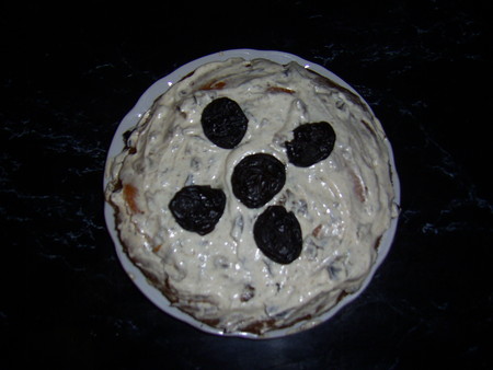 Масло растопить, добавить сахар, вбить яйца по одному, добавить гашенную соду, перемешать. Добавить муку, хорошо вымесить. Тесто разделить на 2 части, в одну добавить какао. Выпекать 25-30 минут при t 225-250° 2 коржа. Каждый корж разрезать пополам. Чернослив распарить 10-15 минут и размельчить. Сметану взбить с сахаром, добавить чернослив, перемешать. Коржи перемазать кремом, чередуя белый и темный. Поставить в холодильник на 5 часов (у нас он до холодильника не дошел