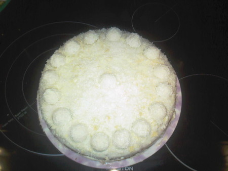 Половинки конфет „Raffaello“ выкладывать по краю торта. В заключении, обсыпать торт со всех сторон кокосовой стружкой.