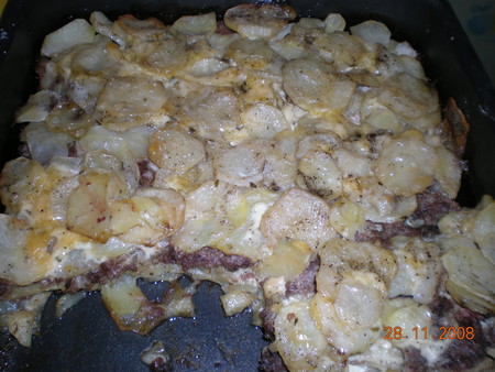 Противень смазать маслом подсолнечным. Беру сырую картошку - где-то 8 шт. средней картофелины на противень, нарезаю круглишками, выкладываю первый слой, солю, перчу, далее лук кольцами, майонезом сверху, дальше ложу фарш (готовый-перченный и т.д.), после него еще один слой картофеля, соль, перец, майонез. И на медленный огонь в духовку на 1-1,5 часа.