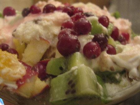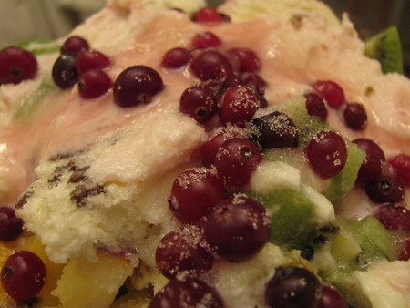 сверху выложить мороженое, сметану(сметану размазать по поверхности фруктов), добавить творожок и йогурт, сверху посыпать клюквой и сахаром. и вуаля:
