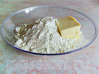 Муку смешиваем с дрожжами, солью, сливочным маслом.
