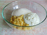 Банановое пюре соединить с сахаром и йогуртом.