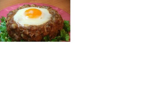 Полученный фарш разделить на четыре части и на смазанном противне сформировать гнедышки. В углубления гнездышек влить яйцо, посолить и в духовку. Готовить при температуре 180 гр. ( лично я готовила при 150 гр. и все приготовилось) 35-40 мин., украсить зеленью.