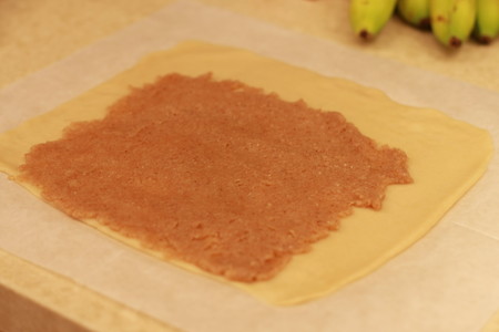 выкладываем на тесто начинку. не надо делать слишком толстый слой, т.к. будет тяжело скручивать рулет. намазывая начинку оставляем побокам и сверху место без начинки(смотрите фото)