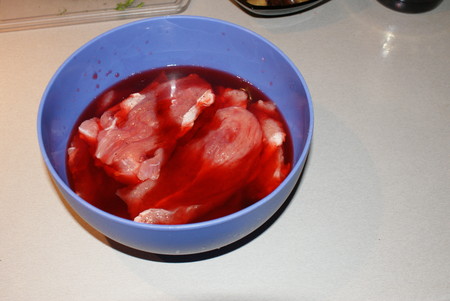 Сложить кусочки мяса в миску или небольшую кастрюлю и залить гранатовым соком.Оставить мясо мариноваться на 30-40 минут.