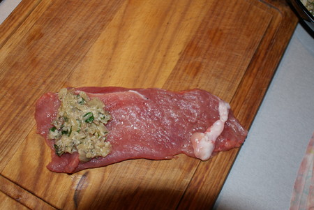 Свернуть мясо в рулетик так, чтобы начинка оказалась внутри.