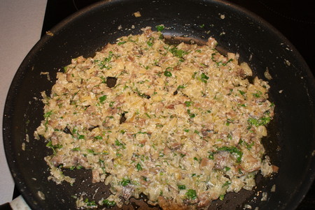 Затем добавить шампиньоны и жарить на среднем огне, помешивая, 8 минут. Посолить и поперчить.