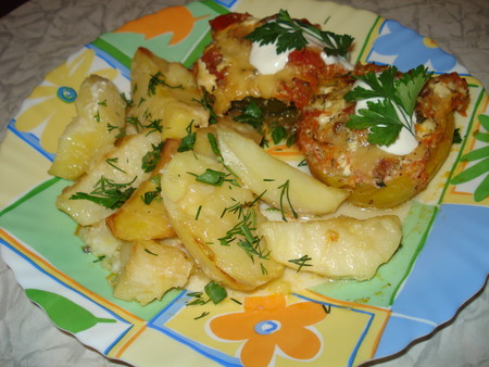 получилось правда не так красиво как хотелось бы, наверное из фарша лучше все таки делать, так как перцы лучше сохранят форму. Картошечку тоже в духовке запекала, предварительно отварив до полуготовности...