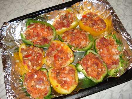 фарш: смешать фарш или мелкорезаное мясо (я делала с мяском, которое ночь мариновала) с мелкорезанным луком,1 тертой морковкой , 1 помидором кубиками и яйцами, соль-приправы по вкусу; перчики разрезать вдоль пополам и нафаршировать, уложить в форму.