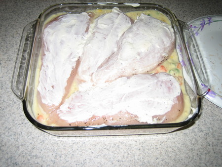 1. смешать баночку супа, воду, рис,чеснок (или лук), перец, овощи. Все это перемешать и выложить в не очень глубокое блюдо для запекания. На верхушку выложить грудки, но грудки отдельно немного можно приправить солью и перчиком. и намазать тонким слоем майонеза.