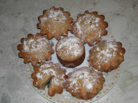 В смазанные маслом формочки выложить тесто.Выпекать при 180 г 15-25 минут.Я выпекала,где-то 35 минут,т.к. духовка такая.Проверяла деревянной палочкой,если не липнет,значит готово.Да и видно стало,как они зарумянились.