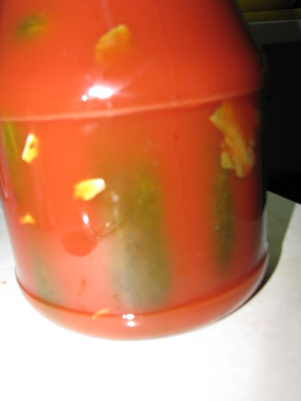 томатный сок или развести томатную пасту водой (в этот раз я взяла 1 литр воды и почти полную банку Помидорки (380г), осталось со столовую ложку пасты), посолить (1,5 ст.л.), можно добавить сахару (я кладу, люблю я сахар в соленья класть, положила 3 ст.л.) по вкусу, если сок уже соленый, то не надо соли, смесь должна быть приятно соленой и приятно сладковатой (напробовалась прилично, пока готовила), если хочется, вскипятить, добавив перец горошком (горошин 10), душистый перец (горошины 3-4), укропный зонтик (если есть) или семена укропа, остудить хоть немного и залить огурцы, уложенные достаточно плотно в банку.