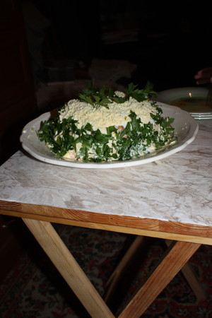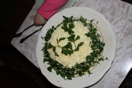 2. Салат выкладывать слоями: картофель-майонез-морковь+лук-сыр-майонез-лосось(сбрызнутая соком лимона)-майонез-яблоко-белки-майонез-желтки. Салат по бокам обмазать майонезом, посыпать укропом. Сверху можно урасить красной рыбкой (солёной). Зеленью, оливками- я не стала этого делать.