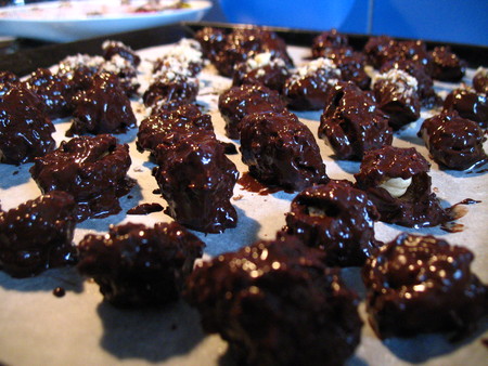 Для разнообразия шоколад можно разделить на 2 части и в одну положить размедьченные орешки, тогда кофетки получаться "ежиками".