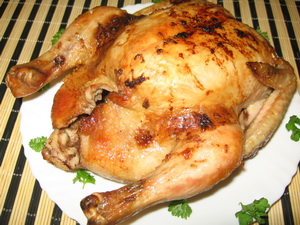 Сок от ананасов смешать с соевым соусом!имбирем и чесноком.Залить этим маринадом курицу!мариновать часа 2.Потом набить курицу кусочками ананаса и запекать в духовке часа 1,5 при температуре 180°