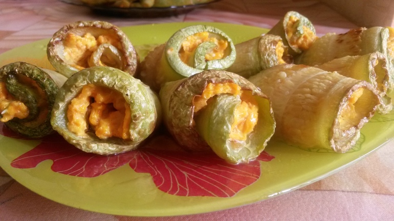 Нарезать тонкими пластинами, обжарить без муки в раскаленном растит. масле. На мелкой терке натереть морковь, в сотейнике немного обжарить на слив. масле, затем немного воды добавить и протомить минут 5. Смешать морковь со сметаной или майонезом + 1-2 зубчика чеснока. Наложить на пластины кабачков и свернуть в рулетики. Объеденье просто! Я делала с майонезом. Приятного аппетита)