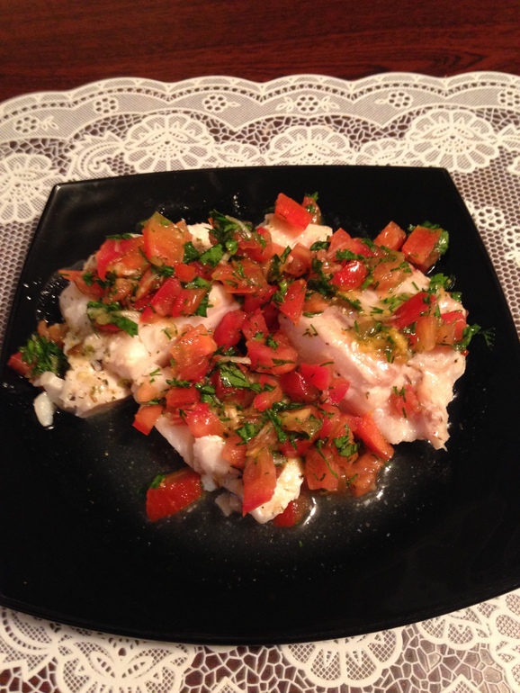 Томаты рубим как можно мельче, добавляем сок лимона, соль, перец, зелень,все перемешиваем.Соус готов.Выкладываем треску на тарелку и поливаем нашим соусом.