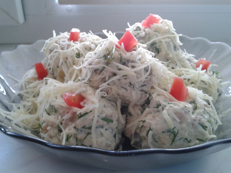 Сделала вчера вот такие шарики. Мои смели на ура. Делюсь рецептиком (да и себе. чтобы не забыть, а то делала из того, что было под рукой). Было следующее - курица, шампиньоны, лук-репка, сыр маасдам, укроп, майонез, помидорка.