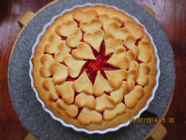Для начинки: Разрезанную клубнику перемешать с сахаром, крахмал заварить водой и довести до кипения с клубникой, пусть немного загустеет. Остудить и выложить в форму. ( В первый раз мне показалось,что начинка очень жидкая и слила часть жидкости. А ЗРЯ! в следующий раз уже не стеснялась и начинку выливала в пирог как есть. Она как-то загустевает в процессе выпекания в духовке.