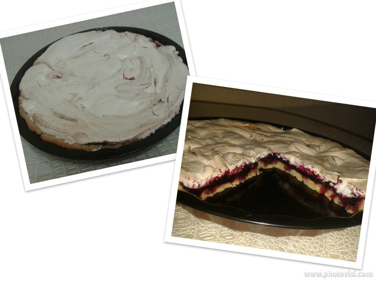 Смешиваем блендером ягоды с сахаром и выкладываем на готовую основу. Взбить белки с сахаром до густой пены, выложить сверху ягод - и обратно в духовку минут на 10.