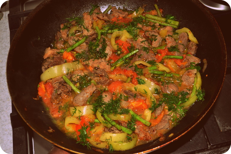 Сначала на оливк.масле обжарить лук до румяной корочки,в лук отправить мясо(мясо промариновала минут 30 в соевом соусе),потом туда же болгарский перец (красиво смотрится когда он длинный),спаржу и помидоры....все это тушится минут 30 при закрытой кышке...затем добавила зелень и чеснок...тушим ещё 10 минут и вуаля)))