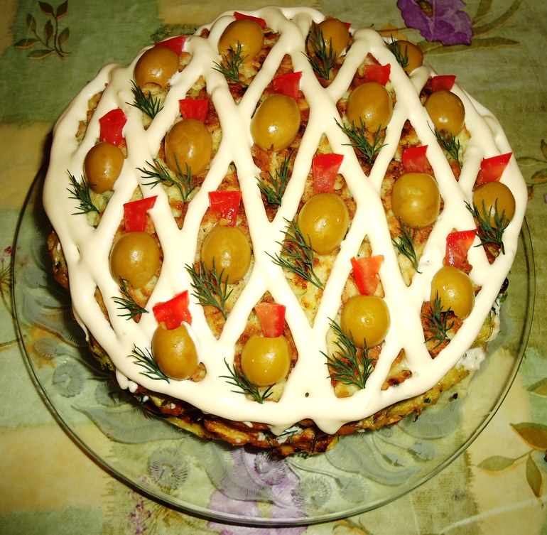 5. Укладывать блины, перемазывая начинкой и тонко нарезанными кружочками плмидора