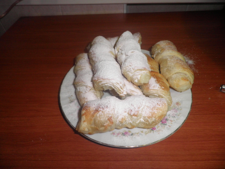 Тесто разрезать на полоски , намотать на конусы( если нет конусов сделайте их из картонной бумаги) и выпекайте. Наполните кремом и посыпте сахарной пудрой, если нет желания делать крем, то можно с сгущенкой.
